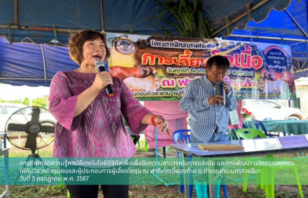 การถ่ายทอดองค์ความรู้การใช้เทคโนโลยีดิจิทัลเพื่อเพื่อขีดความสามารถในการแข่งขัน และการพัฒนานวัตกรรมชุมชน ให้กับวิสาหกิจชุมชนและผู้ประกอบการผู้เลี้ยงโคขุน ณ ฟาร์มลุงก้าน บ้านดอนหัวสะพาน อำเภอด่านขุนทด จังหวัดนครราชสีมา ในวันที่ 5 กรกฎาคม 2567