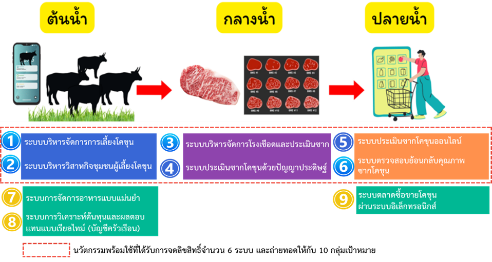 โครงการวิจัยนี้มีวัตถุประสงค์เพื่อปรับและถ่ายทอดนวัตกรรมระบบบริหารจัดการฟาร์มอัจฉริยะ (AI FARM) ซึ่งเป็นเทคโนโลยีพร้อมใช้ระดับ TRL 7 ให้เหมาะสมกับกลุ่มเป้าหมาย คือ ผู้เลี้ยงโคขุนต้นน้ำ และสร้างนวัตกรชุมชนผู้เลี้ยงโคขุนต้นน้ำโดยใช้นวัตกรรมระบบบริหารจัดการฟาร์มอัจฉริยะ (AI FARM) เพื่อยกระดับรายได้ครัวเรือนของเกษตรกรผู้เลี้ยงโคขุนต้นน้ำกลุ่มเป้าหมาย 100 ครัวเรือน จาก 6 กลุ่มวิสาหกิจ ในจังหวัดนครราชสีมาและจังหวัดอุดรธานี นวัตกรรมระบบบริหารจัดการฟาร์มอัจฉริยะ (AI FARM) ซึ่งระบบครอบคลุมการเลี้ยงโคขุนตลอดห่วงโซ่อุปทาน ตั้งแต่ต้นน้ำ กลางน้ำ ถึงปลายน้ำ ประกอบด้วย 6 ระบบ คือ 1) ระบบบริหารจัดการการเลี้ยงโคขุน 2) ระบบบริหารจัดการวิสาหกิจชุมชนผู้เลี้ยงโคขุน 3) ระบบบริหารจัดการโรงเชือดและประเมินซาก 4) ระบบประเมินซากโคขุนด้วยปัญญาประดิษฐ์ 5) ระบบประมูลซากโคขุนออนไลน์ 6) ระบบตรวจสอบย้อนกลับคุณภาพซากโคขุน ซึ่งจากการลงพื้นที่เก็บรวบรวมข้อมูลของคณะวิจัย พบว่า ปัจจุบันเกษตรกรประสบปัญหาราคาขายโคตกต่ำ โดยเฉพาะโคสายพันธุ์พื้นเมือง โคไล่ทุ่ง ซึ่งไม่ได้มีการควบคุมคุณภาพการเลี้ยงและเนื้อไม่ได้คุณภาพตามที่ตลาดบนต้องการ และถูกเนื้อวัวต่างประเทศราคาถูกโจมตีตลาดซื้อขายเนื้อวัว ทำให้เกษตรกรผู้เลี้ยงโคขุนขาดทุนและยกเลิกการเลี้ยงเป็นจำนวนมาก ในขณะที่ปศุสัตว์จังหวัดนครราชสีมาและอุดรธานี ได้ให้การสนับสนุนน้ำเชื้อสายพันธุ์วากิว เพื่อให้เกษตรกรนำไปผสมกับโคพื้นเมืองเพื่อให้ได้เนื้อที่มีคุณภาพ และเป็นที่ต้องการของตลาด ดังนั้น เกษตรกรหลายรายสนใจที่จะปรับเปลี่ยนการเลี้ยงจากโคสายพันธุ์พื้นเมือง เป็นโคสายพันธุ์ผสมวากิวเพื่อเพิ่มมูลค่า โดยเฉพาะการเลี้ยงโคขุนต้นน้ำ ซึ่งใช้ระยะเวลาเลี้ยงประมาณ 1 ปี โดยมีวิสาหกิจและฟาร์มที่ต้องการซื้อโคต้นน้ำไปขุนต่อ โดยมีการทำสัญญารับซื้อ ซึ่งการคัดเลือกสายพันธุ์ น้ำเชื้อที่มีคุณภาพ ที่เป็นที่ต้องการของตลาด เช่น วากิว จะทำให้เนื้อวัวมีคุณภาพสูง และขายได้ราคา นอกจากนี้ ระยะเวลาการเลี้ยง 1 ปี เกษตรกรจำเป็นต้องเก็บรวบรวมข้อมูลด้านต้นทุนอาหาร ส่วนผสมอาหารที่มีเปอร์เซ็นต์โปรตีนที่เหมาะสมทำให้ได้น้ำหนักตัวของวัวที่มากขึ้น ทำให้เกษตรกรสามารถได้รายได้ที่สูงขึ้น